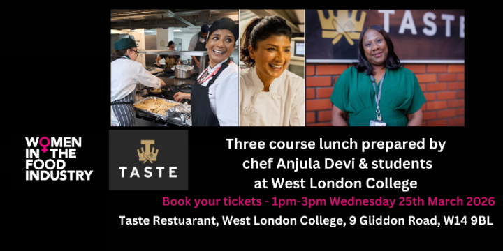 Women in the Food Industry have teamed up with one of West London’s largest catering colleges – West London College – Hammersmith & Fulham Campus, to provide a healthy and highly affordable lunch. You will enjoy a delicious three course menu prepared by Culinary Arts students working with Anjula Devi, Author of best-selling cookbook 15 Minute Indian and Consultant Chef for Manchester Utd. Anjula will be on hand to introduce the dishes for the lunch.